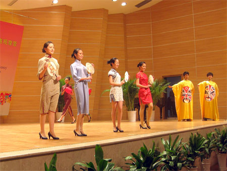 重慶師范大學(xué)空乘專業(yè)學(xué)生在開營(yíng)儀式上表演節(jié)目—服裝展示