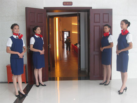 重慶師范大學(xué)地理與旅游學(xué)院藝術(shù)教育(空乘與禮儀方向)2010級(jí)的同學(xué)們?cè)陂_營(yíng)儀式上表現(xiàn)優(yōu)秀,其中劉佳樂(lè)同學(xué)和來(lái)自也門的留學(xué)生Ebrahim共同擔(dān)任了此次活動(dòng)的主持人,她大方得體、從容不迫的主持風(fēng)格得到觀眾好評(píng)。這些未來(lái)將在藍(lán)天翱翔的驕子,將她們美麗的笑容遍布在現(xiàn)場(chǎng)的每一個(gè)角落,從前臺(tái)禮儀、接待、會(huì)場(chǎng)引導(dǎo)的細(xì)小工作到在舞臺(tái)上表演為外國(guó)友人準(zhǔn)備的中國(guó)特色十足的節(jié)目,她們都一絲不茍,認(rèn)真對(duì)待,優(yōu)雅從容,充分展現(xiàn)了空乘學(xué)子的風(fēng)采。