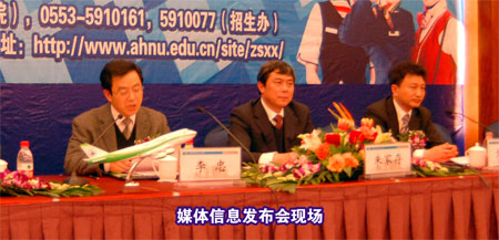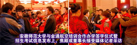 簽字儀式結(jié)束后,舉行了播音與主持藝術(shù)(空乘與禮儀)專業(yè)招生考試信息發(fā)布會(huì)。金通航空培訓(xùn)服務(wù)有限公司董事長(zhǎng)焦殿成和我校教務(wù)處長(zhǎng)、招生辦主任朱家存在招生信息發(fā)布會(huì)上分別介紹了有關(guān)辦學(xué)情況和招生考試信息,并接受了新華社、中央人民廣播電臺(tái)、人民網(wǎng)、安徽日?qǐng)?bào)、安徽電視臺(tái)等媒體記者的采訪。20多家新聞單位及媒體參加信息發(fā)布會(huì)。