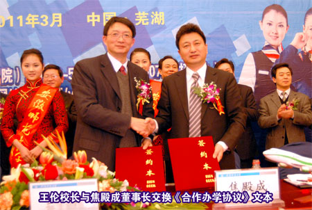 金通航空培訓(xùn)服務(wù)有限公司董事長(zhǎng)兼總經(jīng)理焦殿成先生在致辭中說:2011年,是國(guó)家“十二五”規(guī)劃的第一年。面對(duì)國(guó)家教育體制改革的良好趨勢(shì),適逢我國(guó)民航業(yè)快速發(fā)展的有利契機(jī),重在人才培養(yǎng)模式轉(zhuǎn)變的教育體制改革將勢(shì)在必行,校企合作辦學(xué)作為普通高校創(chuàng)新發(fā)展的路徑,將會(huì)被越來越多的高等院校所認(rèn)同。安徽師范大學(xué)作為全國(guó)普通高等院校尤其是在師范類高等院校中知名的綜合性大學(xué),站在科學(xué)發(fā)展的高度,建立在有利于服務(wù)經(jīng)濟(jì)發(fā)展、有利于提升校企雙方的全面建設(shè)、有利于高校畢業(yè)生陽光就業(yè)和成才創(chuàng)業(yè)的基礎(chǔ)上,今天邁出了值得紀(jì)念的一步。我們與安徽師范大學(xué)采用校企合作辦學(xué)模式,共同開辦本科層次的播音與主持藝術(shù)(空乘與禮儀)專業(yè),是合作雙方認(rèn)真考察、縝密調(diào)研、履行正規(guī)批報(bào)程序所做出的科學(xué)決策。我們本著真誠(chéng)合作、互利雙贏、共同發(fā)展的原則,簽訂了為期8年的合作協(xié)議,目標(biāo)和思路明確,權(quán)利和義務(wù)清楚,職責(zé)和任務(wù)具體?傮w構(gòu)想是:充分發(fā)揮校企雙方的資源優(yōu)勢(shì),立足安徽,面向周邊省市招生,全面實(shí)現(xiàn)學(xué)生綜合素質(zhì)的提高,教學(xué)管理和教學(xué)質(zhì)量的整體提升,努力為祖國(guó)民航業(yè)選拔、培養(yǎng)、輸送合格的空乘人才和管理人才,真正使安徽師范大學(xué)播音與主持藝術(shù)(空乘與禮儀)專業(yè)得到持續(xù)發(fā)展。