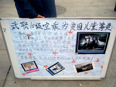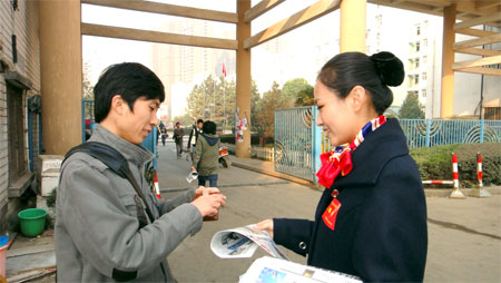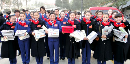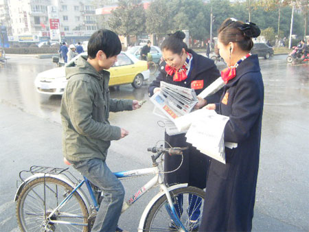 武職空乘專業(yè)學生賣報獻愛心     本網(wǎng)訊 2010年12月5日,武漢職業(yè)技術(shù)學院空中乘務(wù)專業(yè)10級學生和國際日語10301班學生為幫助貴州貧困地區(qū)學生,特舉行了義賣報紙籌捐活動。