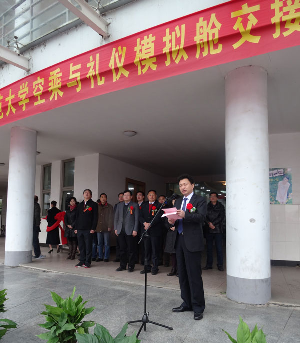 副校長李校長首先致辭,他說,2011年3月1日,安徽師范大學(xué)與北京廣慧金通教育科技有限公司正式簽署合作辦學(xué)協(xié)議,同年9月,首屆空乘專業(yè)同學(xué)進入美麗的師大校園。三年來,雙方真誠合作、攜手共進,順利招收了三屆共計619名空乘學(xué)生,有序開展了各項教學(xué)工作,今天,隨著空乘模擬艙實驗室的正式交接,我們有理由相信空乘專業(yè)的教學(xué)水平和空乘學(xué)子的綜合能力將會邁上一個新的臺階!