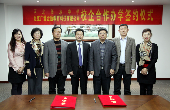 2015年4月9日,建立在校企合作、創(chuàng)新發(fā)展的基礎(chǔ)上,河北衡水中學(xué)與北京廣慧金通教育科技有限公司就聯(lián)合舉辦“校企合作(高中起點(diǎn))定向培養(yǎng)航空飛行員和乘務(wù)員、安全員”項(xiàng)目簽訂了《合作辦學(xué)協(xié)議》。在雙方的共同努力下,合作項(xiàng)目正式啟動并順利實(shí)施,在逐步健全和完善校企合作機(jī)制上取得了實(shí)質(zhì)性進(jìn)展。河北衡水中學(xué)副校長王建勇、北京廣慧金通教育科技有限公司董事長焦殿成代表雙方在合作協(xié)議上簽字。