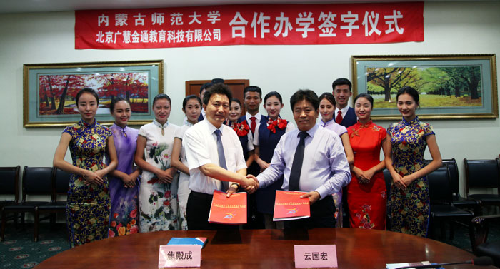 2015年7月23日,內(nèi)蒙古師范大學(xué)與北京廣慧金通教育科技有限公司在華北民航培訓(xùn)中心舉行了校企合作辦學(xué)簽字儀式。內(nèi)蒙古師范大學(xué)校長(zhǎng)云國(guó)宏,副校長(zhǎng)張海峰,旅游學(xué)院院長(zhǎng)郝志成,校辦公室主任霍日查,北京廣慧金通教育科技有限公司董事長(zhǎng)焦殿成,副總經(jīng)理郭文、王斌、劉旭、王艷霞等領(lǐng)導(dǎo)參加了此次簽約儀式。
