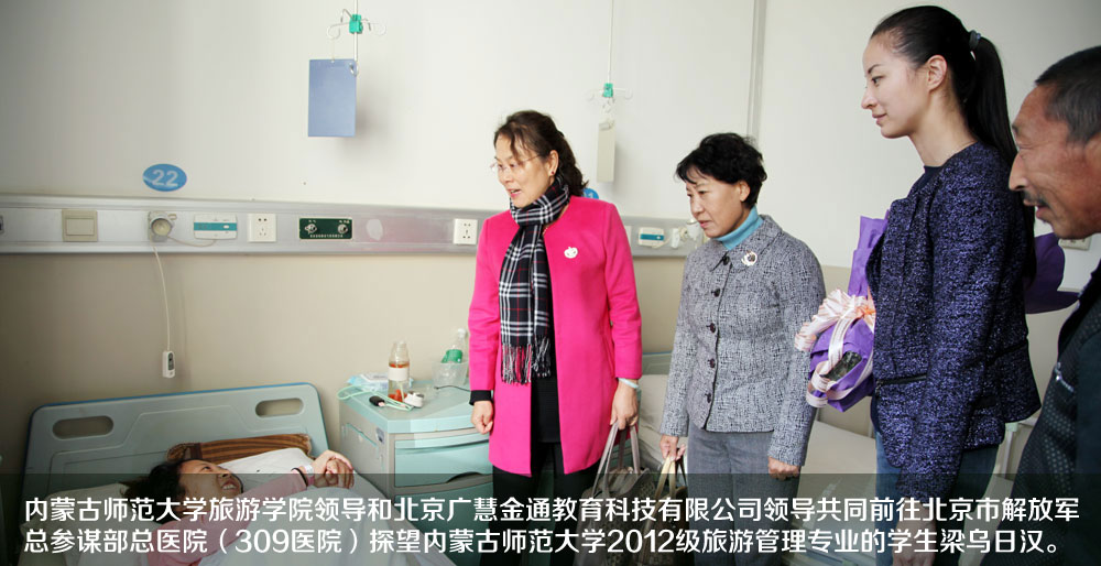 在探望梁烏日漢同學(xué)的過程中,內(nèi)蒙古師范大學(xué)旅游學(xué)院王曉霞書記及北京廣慧金通教育科技有限公司的部門領(lǐng)導(dǎo)都被她的樂觀和堅(jiān)強(qiáng)的精神所感染。梁烏日漢說,她現(xiàn)在做了一個(gè)微創(chuàng)穿刺,還做了一個(gè)腰部手術(shù),之后吃一年半的藥,然后要取出腰部的釘子。是否做手術(shù)要根據(jù)每個(gè)月的檢查結(jié)果判斷。雖然在得知患病的第一時(shí)間,她也曾傷心絕望,但來自學(xué)校、公司等社會(huì)各界的關(guān)愛和幫助,正幫她一點(diǎn)一點(diǎn)地渡過難關(guān)。所以,為了回報(bào)母校以及北京廣慧金通教育科技有限公司的幫助,更要保證自己樂觀的心態(tài)和戰(zhàn)勝病魔的決心。這樣才能盡快好起來,然后重新回到校園,努力做對(duì)社會(huì)有用的人。
