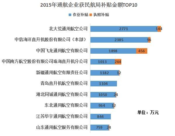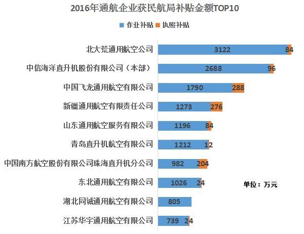 2014-2016年三年來,獲得補(bǔ)貼金額總計(jì)最多的10家通航企業(yè)分別為:北大荒通航、中信海直(本部)、飛龍通航、新疆通航、青島直升機(jī)、南航珠直、東北通航、山東通航、同誠通航、華宇通航。