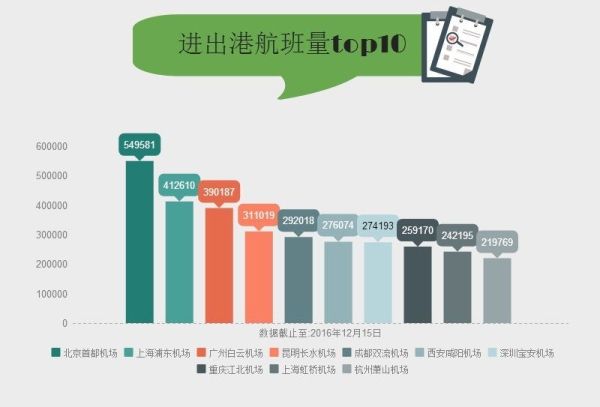 在進(jìn)出港航班量方面,機(jī)場進(jìn)出港總量最大的前三名分別為:北京首都機(jī)場(54萬)、上海浦東機(jī)場(41萬)和廣州白云機(jī)場(39萬)。其中,北京首都機(jī)場進(jìn)出港總航班量約為第五名成都雙流機(jī)場(29萬)及第六名西安咸陽機(jī)場(27萬)航班量之和,成為最繁忙的國際空港。
