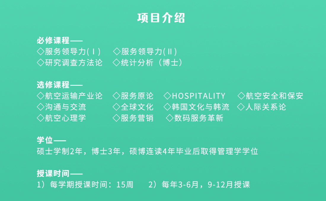韓國航空大學(xué)(한국항공대학교,Korea Aerospace University), 簡稱航空大(KAU),是韓國唯一一所航空宇宙領(lǐng)域的專門高等學(xué)府,致力于培養(yǎng)航空宇宙方面的專業(yè)人才的特殊化大學(xué)。韓國航空大學(xué),成立于1952年,是韓國首所國立航空教育機(jī)構(gòu)。到2022年,國立韓國航空大學(xué)建校70周年,F(xiàn)為大韓航空所屬的韓進(jìn)集團(tuán)旗下大學(xué)。韓國航空大學(xué)碩士、博士、碩博連讀學(xué)科專業(yè)——航空服務(wù)學(xué)系,極具特色及優(yōu)勢(shì),正在熱招中。
