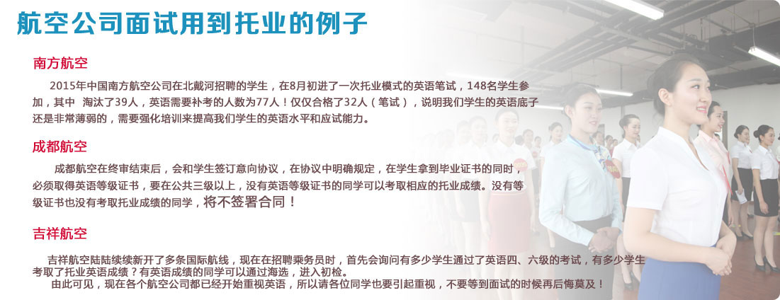 由于乘務(wù)員職業(yè)需要無(wú)國(guó)界的與人交流,也隨著我國(guó)民航事業(yè)的發(fā)展壯大,對(duì)民航乘務(wù)員英語(yǔ)水平要求的不斷提高,近年國(guó)航、南航、海航等國(guó)內(nèi)航空公司都早已開(kāi)始采用國(guó)際標(biāo)準(zhǔn)來(lái)選拔乘務(wù)員,這也就是我們?yōu)槭裁匆恢痹诔珜?dǎo)托業(yè)英語(yǔ)培訓(xùn)與考試。